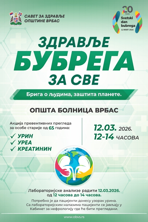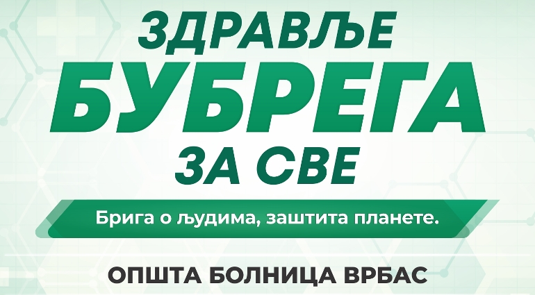 Поводом Светског дана бубрега, Савет за здравље општине Врбас, у сарадњи са Општом болницом Врбас, организоваће акцију превентивних прегледа за особе старије од 65 година. Сличне акције на иницијативу Међународног друштва за нефрологију и Интернационалног удружења Фондације за бубрег биће изведене у више од 100 земаља широм света, под заједничким слоганом „Здравље бубрега за све – Брига о људима, заштита планете“.